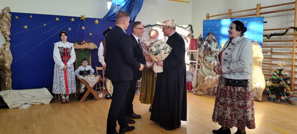 Na zakończenie Dyrektor dr Bronisław Chowaniec-Lejczyk wraz z Zastępcą Wójta Maciejem Dziubasem oraz z p. Katarzyną Kasprzak-Kuros i p. Marią Strączek Fabianką reprezentującymi Zespół Harnasie, złożyli życzenia imieninowe księdzu Proboszczowi dr Dariuszowi Guziakowi.